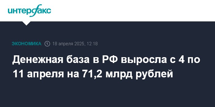 На 4 апреля денежная база в России равнялась 17 948 млрд рублей. Таким образом, за период она выросла на 0,40%, или на 71,2 млрд рублей.