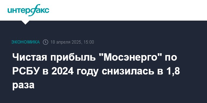 Чистая прибыль "Мосэнерго" по РСБУ в 2024 году снизилась в 1,8 раза