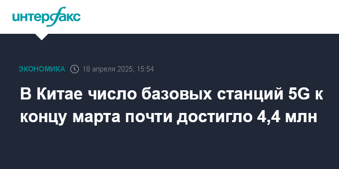 Москва. 18 апреля. INTERFAX.RU - В Китае на конец марта количество базовых станций сетей связи нового поколения 5G превысило 4,39 млн, сообщило "Синьхуа" со ссылкой на Министерство промышленности и информатизации..