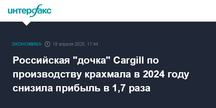 Российская "дочка" Cargill по производству крахмала в 2024 году снизила прибыль в 1,7 раза