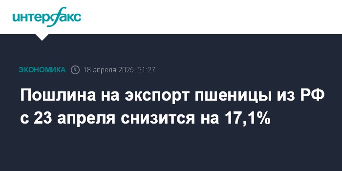 Москва. 18 апреля. INTERFAX.RU - Ставка пошлины на экспорт пшеницы из РФ с 23 апреля снизится на 17,1%, до 1 832 рублей с 2 210,1 рубля за тонну неделей ранее, сообщает Минсельхоз.