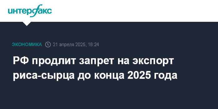Москва. 21 апреля. INTERFAX.RU - РФ продлит запрет на экспорт нешелушеного риса (риса-сырца) на период с 1 июля до конца 2025 года.