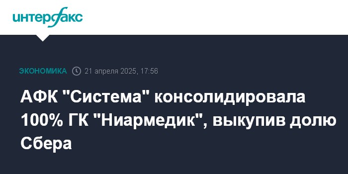 "АФК "Система" осенью 2024 года консолидировала 100% долей в ГК "Ниармедик", став владельцем доли Сбера, что соответствует условиям акционерного соглашения, заключенного осенью 2021 года. ГК "Ниармедик" обладает потенциалом развития, а компетенции АФК "Система" в фармацевтике, медицине и биотехнологиях существенно повысят ее акционерную стоимость", - сообщили в корпорации.