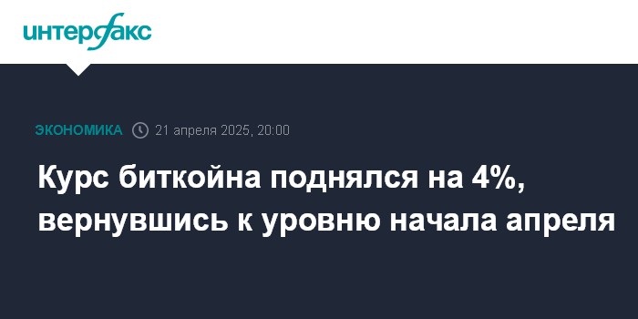 Москва. 21 апреля. INTERFAX.RU - Курс биткойна поднялся более чем на 4% на торгах в понедельник, вернувшись к уровню, на котором он находился в начале апреля, до объявления президентом США Дональдом Трампом о введении крупных пошлин в отношении большинства торговых партнеров страны.