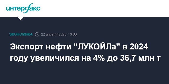 Москва. 22 апреля. INTERFAX.RU - Экспорт нефти "ЛУКОЙЛа" в 2024 году увеличился по сравнению с 2023 годом на 4% до 36,7 млн т., экспорт нефтепродуктов снизился на 17,4% до 14,7 млн т. Об этом сообщается в годовом отчете компании, опубликованном к собранию акционеров.