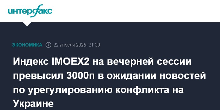 Москва. 22 апреля. INTERFAX.RU - Индекс IMOEX2 на вечерней сессии во вторник превысил рубеж 3000 пунктов, продолжив позитивную динамику основных торгов на ожиданиях прогресса в процессе мирного урегулирования военного конфликта на Украине.