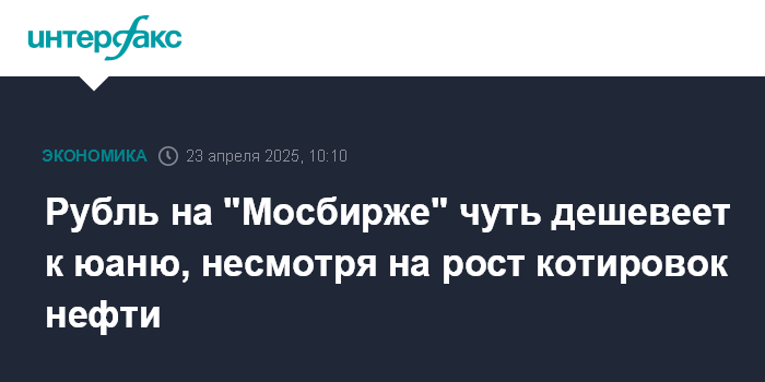 Москва. 23 апреля. INTERFAX.RU - На "Московской бирже" утром в среду рубль слегка дорожает к юаню, несмотря подорожание нефти.