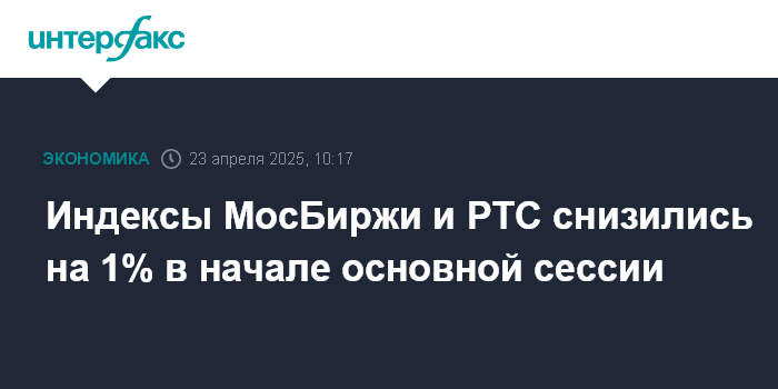 Москва. 23 апреля. INTERFAX.RU - Рынок акций РФ на старте торгов основной сессии на МосБирже в среду снижается из-за возникших сомнений в скором урегулировании военного конфликта на Украине, в то время как внешняя фондовая конъюнктура улучшилась и дорожает нефть (фьючерс на Brent превысил $68 за баррель). Индексы МосБиржи и РТС за минуту основных торгов снизились на 1% к уровню закрытия основой сессии накануне, лидируют в снижении акции ПАО "Южуралзолото" (-3%) и ПАО "Полюс" (-3%) на фоне упавшего золота (цена драгметалла упала на 2,9%, до $3320 за унцию).