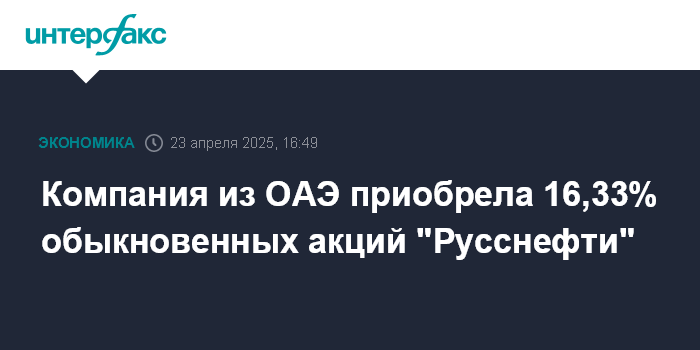 Компания из ОАЭ приобрела 16,33% обыкновенных акций "Русснефти"