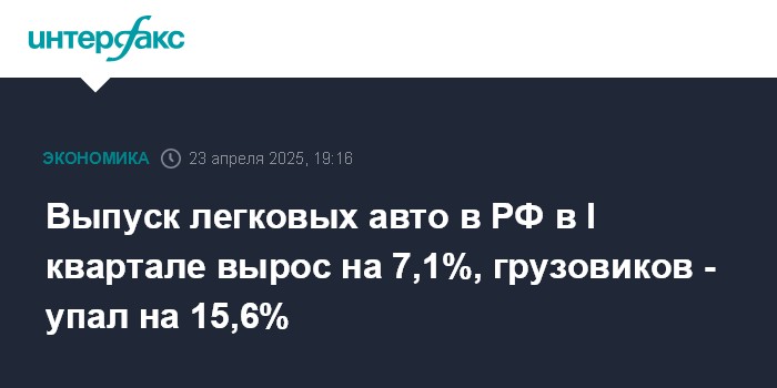 Москва. 23 апреля. INTERFAX.RU - Производство легковых автомобилей в РФ в январе-марте 2025 года выросло на 7,1% в сравнении с тем же периодом прошлого года, выпуск грузовиков упал на 15,6%, сообщила Федеральная служба государственной статистики (Росстат).