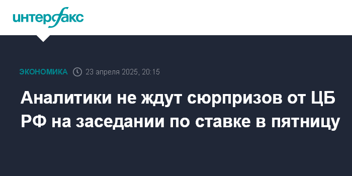 Москва. 23 апреля. INTERFAX.RU - Аналитики единогласно ждут сохранения ключевой ставки ЦБ РФ в ближайшую пятницу, 25 апреля, на уровне 21% (третий раз подряд). При этом большинство экспертов надеются на смягчение регулятором риторики.