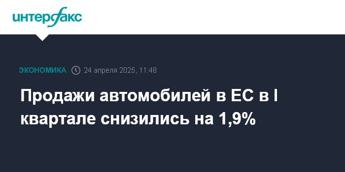 Москва. 24 апреля. INTERFAX.RU - Продажи автомобилей в Европейском союзе в первом квартале сократились на 1,9% по сравнению с тем же периодом годом ранее. Об этом говорится в сообщении Европейской ассоциации производителей автомобилей (ACEA).