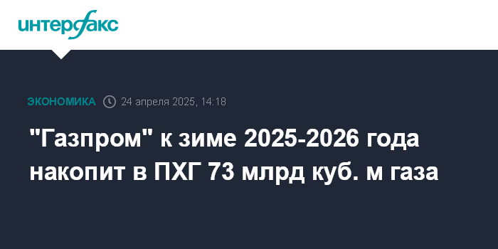 Москва. 24 апреля. INTERFAX.RU - "Газпром" к отопительному сезону 2025-2026 годов создаст оперативный резерв газа в российских подземных хранилищах в размере 73,17 млрд куб. м (что станет абсолютным историческим рекордом), обеспечит максимальную суточную производительность на уровне 858,8 млн куб. м (на достигнутом ранее рекордном уровне).