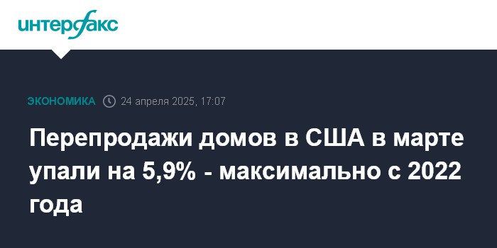 Перепродажи домов в США в марте упали на 5,9% - максимально с 2022 года