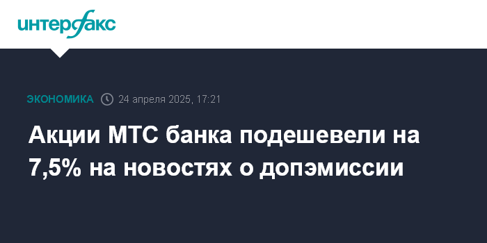 Москва. 24 апреля. INTERFAX.RU - Акции МТС банка подешевели на "Московской бирже" на 7,5% (до 1200 рублей за штуку) на новостях о допэмиссии.