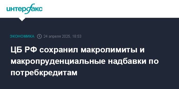 Москва. 24 апреля. INTERFAX.RU - Банк России сохранил значения макропруденциальных лимитов по необеспеченным потребительским кредитам и займам на III квартал 2025 года, оставил неизменными значения макропруденциальных надбавок, говорится в сообщении регулятора.