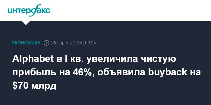 Москва. 25 апреля. INTERFAX.RU - Американская Alphabet Inc., холдинговая компания Google, в первом квартале 2025 года увеличила чистую прибыль на 46% и выручку - на 12%, что оказалось лучше прогнозов экспертов.
