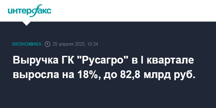 Москва. 25 апреля. INTERFAX.RU - Выручка ГК "Русагро" в первом квартале этого года до межсегментных элиминаций составила 82,793 млрд рублей, что на 18% больше, чем за аналогичный период 2024 года, сообщает компания.