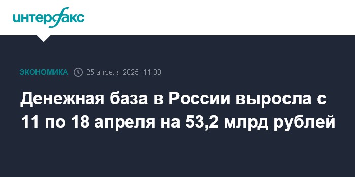 На 11 апреля денежная база в России равнялась 18 019,2 млрд рублей. Таким образом, за период она выросла на 0,30%, или на 53,2 млрд рублей.