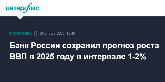 Москва. 25 апреля. INTERFAX.RU - Банк России сохранил прогноз роста ВВП в 2025 году в интервале 1-2%, говорится в среднесрочном прогнозе ЦБ.