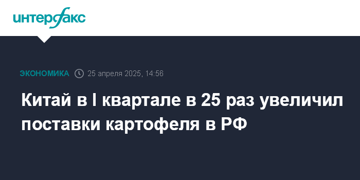 Москва. 25 апреля. INTERFAX.RU - Китай в первом квартале этого года экспортировал в Россию картофель на $10,955 млн, что в 25 раз больше, чем за аналогичный период 2024 года (на $432,9 тыс.), сообщается в материалах Государственного таможенного управления (ГТУ) КНР.