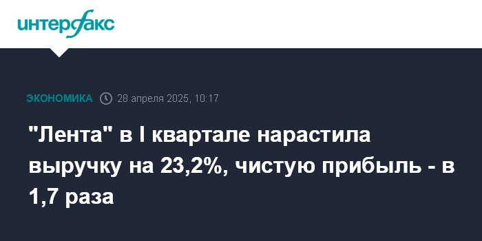 Москва. 28 апреля. INTERFAX.RU - МКПАО "Лента" в I квартале 2025 года нарастило выручку на 23,2%, до 248,8 млрд рублей, сообщила компания.