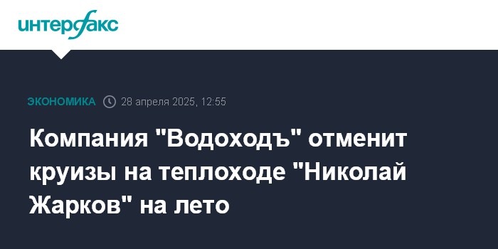 Москва. 28 апреля. INTERFAX.RU - Круизный оператор "Водоходъ" отменит запланированные на лето 2025 года круизы на теплоходе "Николай Жарков" в связи с тем, что он не будет достроен в срок, сообщает Ассоциация туроператоров России (АТОР).