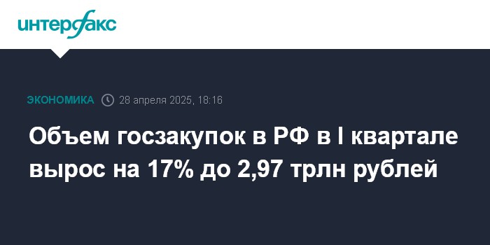 Москва. 28 апреля. INTERFAX.RU - Объем госзакупок в I квартале текущего года составил 2,97 трлн рублей, что на 17% больше, чем за аналогичный период 2024 года. Об этом говорится в отчете Минфина РФ о результатах мониторинга закупок товаров, работ, услуг, осуществляемых в соответствии с законом "О контрактной системе" (44-ФЗ).