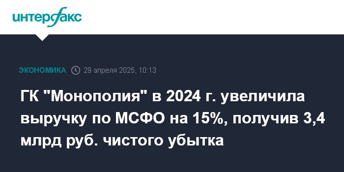 ГК "Монополия" в 2024 г. увеличила выручку по МСФО на 15%, получив 3,4 млрд руб. чистого убытка