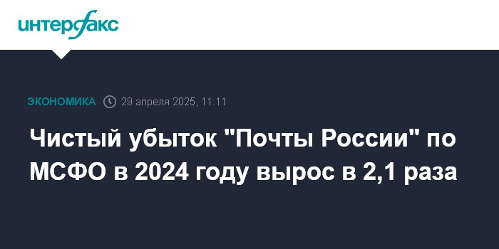 Москва. 29 апреля. INTERFAX.RU - Консолидированный чистый убыток АО "Почта России" по МСФО в 2024 году составил 17,1 млрд рублей, что в 2,1 раза превышает убыток за 2023 год (8,1 млрд рублей), говорится в отчетности компании.