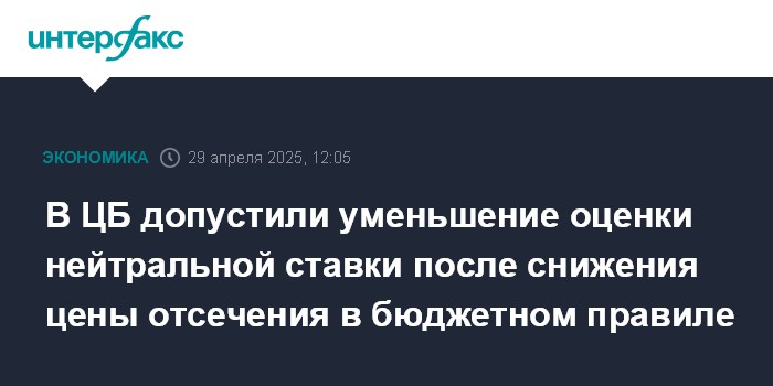 Москва. 29 апреля. INTERFAX.RU - Потенциальное снижение цены отсечения нефти в бюджетном правиле может стать фактором уменьшения оценки уровня нейтральной ставки (сейчас 7,5-8,5%), считает советник председателя ЦБ РФ Кирилл Тремасов.