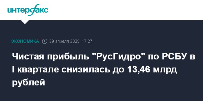 Москва. 29 апреля. INTERFAX.RU - Чистая прибыль ПАО "РусГидро" по РСБУ в I квартале 2025 года снизилась на 9,8% по сравнению с аналогичным периодом прошлого года, до 13,46 млрд рублей, говорится в отчете компании.