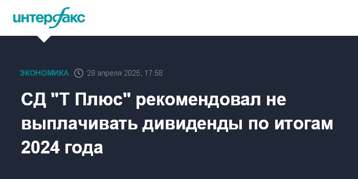 Москва. 29 апреля. INTERFAX.RU - Совет директоров ПАО "Т Плюс" рекомендовал не выплачивать дивиденды по итогам 2024 года, говорится в раскрытии компании.