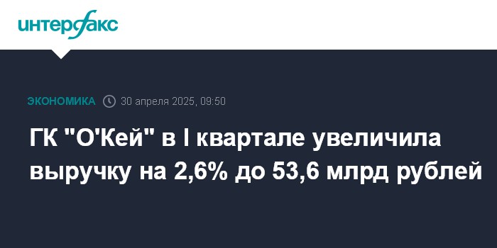 Москва. 30 апреля. INTERFAX.RU - Ритейлер ГК "О`Кей" (O`Key Group) в I квартале 2025 года увеличил чистую розничную выручку на 2,6% до 53,6 млрд рублей, сообщила компания.