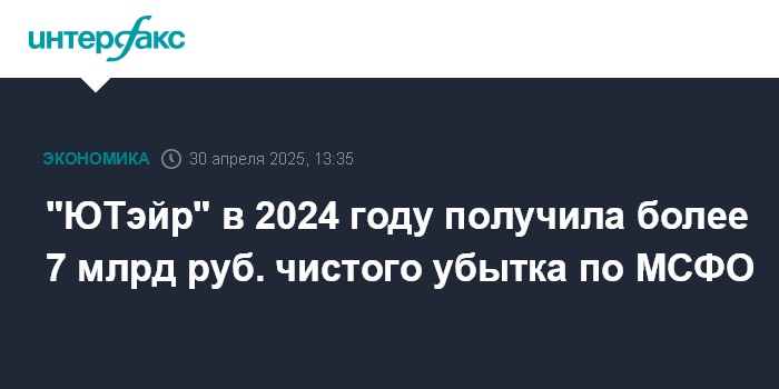 Москва. 30 апреля. INTERFAX.RU - Группа "ЮТэйр" в 2024 году получила более 7 млрд руб. чистого убытка по МСФО против 2,8 млрд руб. прибыли за 2023 год, говорится в отчете компании.