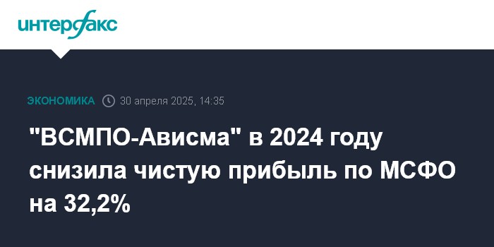 Москва. 30 апреля. INTERFAX.RU - ПАО "Корпорация "ВСМПО-Ависма" в 2024 году сократило чистую прибыль по МСФО в на 32,2% по сравнению с 2023 годом до 16,85 млрд рублей, говорится в отчетности компании.