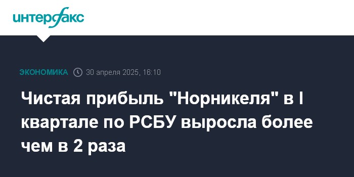 Москва. 30 апреля. INTERFAX.RU - Чистая прибыль "Норникеля" в I квартале по РСБУ выросла более чем в 2 раза до 61 млрд рублей, сообщила компания в среду.