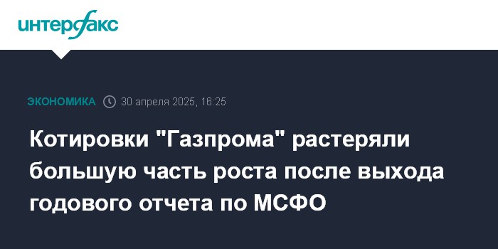 Москва. 30 апреля. INTERFAX.RU - Акции "Газпрома" на торгах на "Московской бирже" остаются в плюсе, но растеряли большую часть своего дневного роста после публикации финансового отчета компании по МСФО за 2024 год.