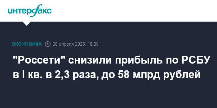 "Россети" снизили прибыль по РСБУ в I кв. в 2,3 раза, до 58 млрд рублей