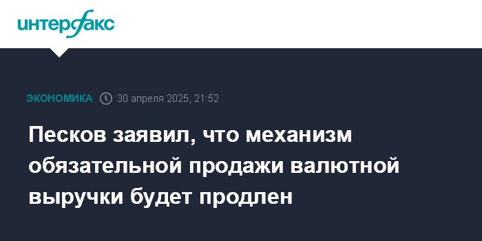 Москва. 30 апреля. INTERFAX.RU - Режим обязательной репатриации и продажи части валютной выручки крупнейших экспортеров, введенный в 2023 году президентским указом, будет вновь пролонгирован, сообщил "Интерфаксу" пресс-секретарь главы государства Дмитрий Песков.