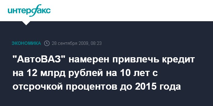 Москва. 28 сентября. INTERFAX.RU - ОАО "АвтоВАЗ" намерено привлечь кредит на 12 млрд рублей сроком на 10 лет с отсрочкой выплаты процентов по нему до 2015 года, говорится в презентации антикризисной программы предприятия, представленной комиссии первого вице-премьера РФ Игоря Шувалова, текст которой имеется в распоряжении "Интерфакса".