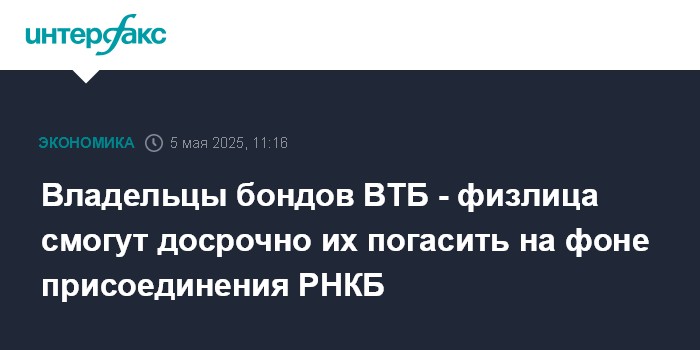 Владельцы бондов ВТБ - физлица смогут досрочно их погасить на фоне присоединения РНКБ