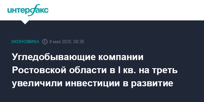 Москва. 6 мая. INTERFAX.RU - Угледобывающие компании Ростовской области в январе-марте 2025 года инвестировали в свое развитие свыше 900 млн рублей, что на 34% больше, чем годом ранее, сообщил "Интерфаксу" заместитель губернатора региона Игорь Сорокин.