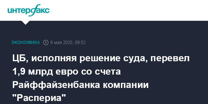 Москва. 6 мая. INTERFAX.RU - ЦБ РФ в рамках исполнения решения суда перевел почти 1,9 млрд евро со счета Райффайзенбанка на счет МКАО "Распериа", говорится в пресс-релизе австрийского Raiffeisen Bank International AG (RBI).