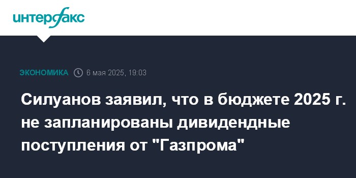 Москва. 6 мая. INTERFAX.RU - Бюджетом 2025 года не запланированы дивидендные поступления от "Газпрома", сообщил журналистам министр финансов РФ Антон Силуанов.