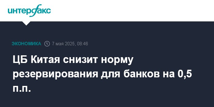 Москва. 7 мая. INTERFAX.RU - Народный банк Китая (НБК, центробанк страны) снизит норму обязательных резервов (RRR) для банков с 15 мая на 0,5 процентного пункта (п.п.), заявил глава ЦБ Пань Гуншэн.