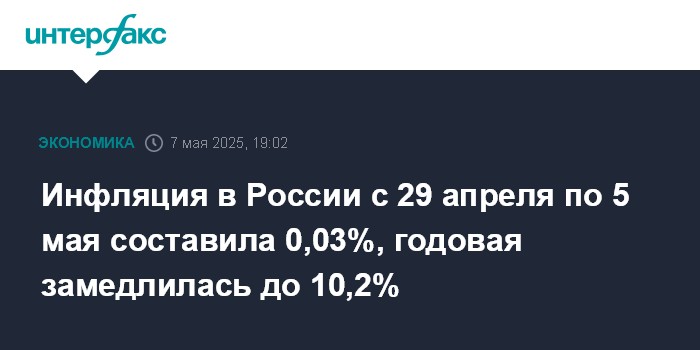 Москва. 7 мая. INTERFAX.RU - В России инфляция с 29 апреля по 5 мая 2025 года составила 0,03% после 0,11% с 22 по 28 апреля, 0,09% с 15 по 21 апреля, 0,11% с 8 по 14 апреля и 0,16% с 1 по 7 апреля, сообщил Росстат.