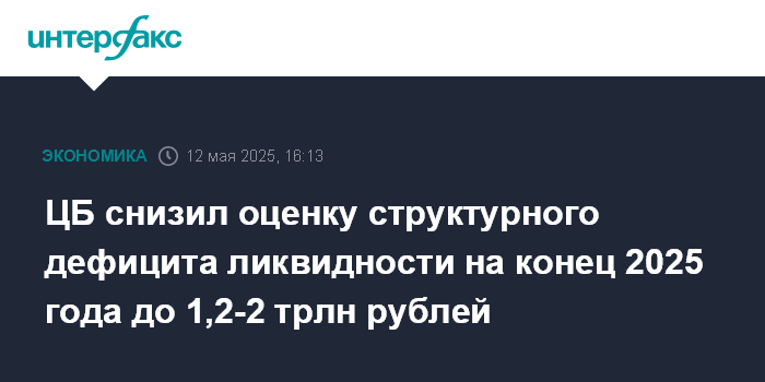 Москва. 12 мая. INTERFAX.RU - Банк России снизил оценку структурного дефицита ликвидности банковского сектора на конец 2025 года до 1,2-2 трлн рублей с прежних ожиданий в 1,6-2,4 трлн рублей, говорится в комментарии к среднесрочному прогнозу регулятора.