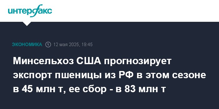Москва. 12 мая. INTERFAX.RU - Минсельхоз США дал первые прогнозы производства и экспорта зерна в новом сельхозгоду (июль 2025-июнь 2026 гг.). Согласно им, РФ сохранит лидерство на мировом рынке пшеницы.