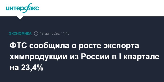 Москва. 13 мая. INTERFAX.RU - В январе-марте 2025 года экспорт химической продукции и каучуков из России вырос на 23,4% в годовом измерении, до $7,5 млрд, говорится в материалах на сайте Федеральной таможенной службы.